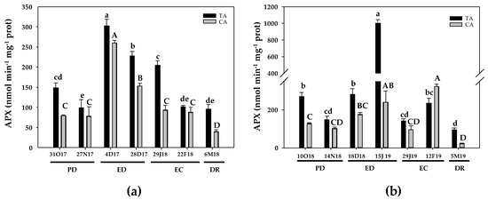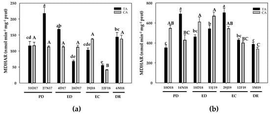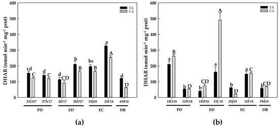Regarding the DHAR activity, during the first season and in both locations an over-30% increase at the end of ED was followed by an activity peak at the end of EC. Then, the activity at DR reached the initial values in the TA, whereas it dropped by half the initial values in the CA (Figure 9a). During the second season and in both locations, DHAR activity declined at the end of PD and at the onset of EC. Then, DHAR activity peaked at the end of ED in the CA, whereas a strong decrease occurred in both locations at the onset of EC and at DR (Figure 9b).