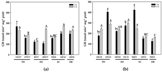 During the first season and in the TA, the GR activity showed a decline at the end of PD, as well as during ED and at the onset of EC. At the end of EC and at DR, the activity levels recovered but did not reach the initial values (Figure 10a). In the CA, GR decreased at the end of PD and the beginning of ED and EC. However, GR activity reached initial levels at the end of ED and EC as well as at DR (Figure 10a). During the second season, in the TA, GR activity peaked at the end of PD and the initial EC, whereas no significant differences were observed in the other periods with respect to the initial values (Figure 10b). In the CA, GR activity remained statistically unchanged during PD, ED and the onset of EC. Finally, a decline of about 33% was produced at the end of EC and at DR (Figure 10b).