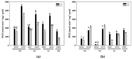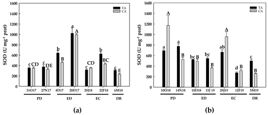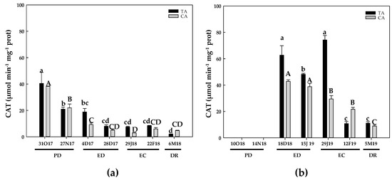 During the first season, the CAT activity displayed a progressive decrease during the dormancy period in both locations, reaching a minimum at DR, mainly in the TA (Figure 15a). In the second season, CAT activity was not detected at PD. Then CAT activity was detected at ED and, as in the first season, declined at the end of EC and DR compared to the initial values (Figure 15b).