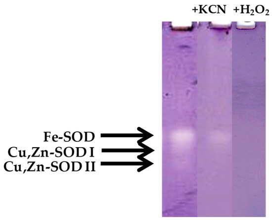 Regarding SOD activity, during the first season and in the TA, increased values with respect to the initial ones at ED (250%) and the end of EC (100%) were observed (Figure 11a). Similarly, in the CA, SOD activity peaked at ED (ca. 250%) and then dropped, reaching values below the initial ones at DR (Figure 11a). During the second season and in the TA, SOD activity declined about 25% in ED, and mainly at the end of EC, when a 2.5-fold decrease was observed. Then, SOD activity showed an increase at DR, in relation to the previous phase, but the activity value was still 28% lower than the initial activity (Figure 11b). In the CA, SOD activity declined substantially at PD and ED as well as at the end of EC and at DR. However, SOD activity recovered to the initial values at the onset of EC (Figure 11b). Native PAGE revealed the presence of three different SOD isoenzymes in floral buds from the peach variety GEM020. Figure 12 shows the referred three bands in samples of the TA at DR as representative. According to the results obtained with the selective inhibitors (KCN and H2O2), a Fe-containing SOD and two Cu,Zn-containing SODs, named I and II in order of increasing mobility, were observed (Figure 12).