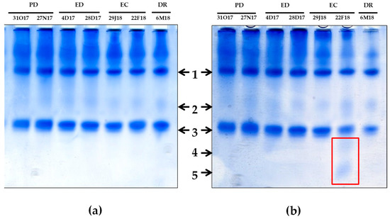 Pattern of peroxidase (POX) isoenzymes in native PAGE for peach ‘GEM020’ flower buds cultivated in two different geographical areas during the dormancy cycle. (a)Temperate area; (b) Cold area. Numbers (1–5) and arrows indicate bands in increasing order of mobility. Bands 4 and 5, detected only in the cold area, are framed in red. Ten micrograms of proteins per line were loaded.