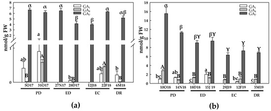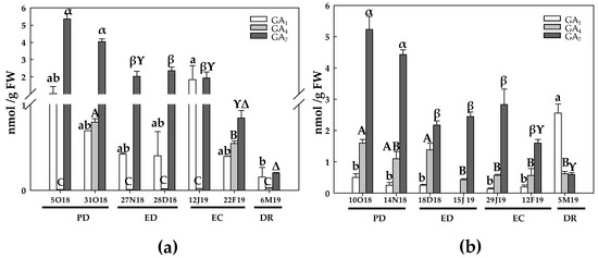 During the first season and in the CA, the GA1 contents were statistically unchanged, its maximum value being recorded at the onset of EC and the lowest at DR (Figure 17a). The initial GA4 levels were very low, as observed at ED. In this case, a dramatic increase in GA4 occurred at the end of PD and EC (Figure 17a). GA7 contents gradually decreased from PD to DR near 90% (Figure 17a). During the second season, GA1 levels were unchanged during the dormancy process, but a 20-fold increase took place at DR. GA4 levels were constant during PD and at the onset of ED. However, from that moment on, GA4 levels showed a decrease (3 to 4-fold) until DR (Figure 17b). GA7 levels, similarly to that observed in the first season, reached the lowest value at DR (about a 9-fold decrease) (Figure 17b).