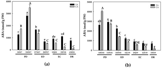 Evolution of abscisic acid (ABA) content in flower buds of peach ‘GEM020’ cultivated in a cold area during the dormancy cycle on two seasons. (a): season 1 (2017–2018); (b): season 2 (2018–2019). Data represent the mean ± SE, n = 5. Different letters (lowercase and uppercase for the samples of the temperate (TA) and the cold area (CA), respectively) indicate significant differences according to Tukey’s multiple test (p ≤ 0.05). PD: paradormancy; ED: endodormancy; EC: ecodormancy; DR: dormancy release. FW: fresh weight. The chill units accumulated at the different times and locations are shown in Supplemental file 1.