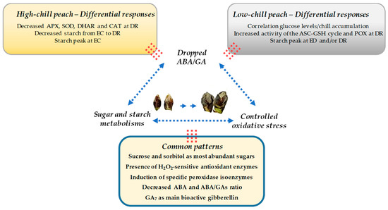 In synthesis, a possible interaction sugars-hormones-ROS could take place in high-chill peach buds, favoring the DR process, suggesting that redox interactions as well as sugar metabolism can govern bud DR, regardless of chilling requirements.