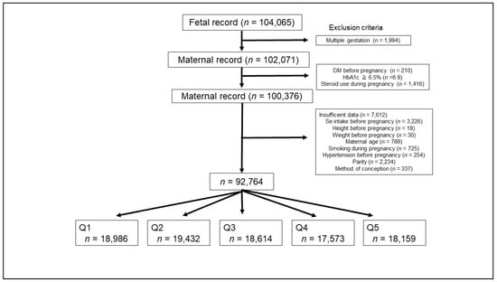 Previous studies reported that reduced maternal Se levels are associated with recurrent early pregnancy loss and pre-eclampsia [17,18,19,20,21]. However, there is little evidence regarding the effect of preconception Se intake on the development of GDM via its antioxidant effects. One of the oxidative DNA damage products, 8-hydroxy-2′-deoxyguanosine (8-OHdG), is excreted directly into the urine and is a sensitive biomarker of oxidative stress [22]. In this study, we examined whether maternal preconception Se intake was associated with the occurrence of GDM in Japanese women using data from a large Japanese cohort study. We used the maternal urine 8-OHdG concentrations during pregnancy to assess maternal oxidative stress.