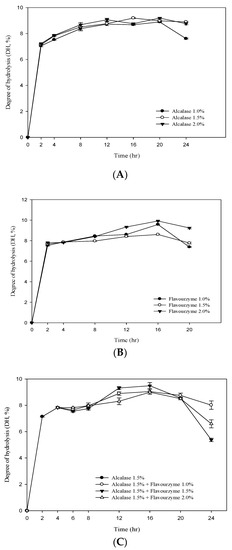 Figure 1A,B shows the DH value of RJ protein by adding different concentrations ofalcalase and flavourzyme(enzyme/substrate ratios = 1%, 1.5% and 2.0%). The results showed that the DH value of RJ protein increased significantly with the increase in the assay time. At the beginning of the hydrolysis (2 h), the DH values (E/S = 1.5) of the two enzymes were 7.13% and 7.67% foralcalase and flavourzyme, respectively. After 20 h of hydrolysis, the DH values of the two (E/S = 1.5) were 8.99% and 8.59%, respectively. The two-stage hydrolysis of RJ protein by alcalase and flavourzyme was monitored for up to 20 h (Figure 1C). In the first stage, the highest DH value was 7.82% using alcalase (hydrolysis time 4 h; E/S = 1.5%). In the second stage, flavourzyme was added (hydrolysis time 16 h; E/S = 1.0%, 1.5% and 2.0%) and the DH values were 9.03%, 9.47% and 8.98%. Figure 1C clearly indicates that the DH increased with an increasing enzyme concentration and that it was positively related to the duration of hydrolysis. The study also found that the DH tended to decrease when the hydrolysis time was between 16–24 h (Figure 1). The reason may be the plastein effect reaction. The plastein reaction refers to the formation of gel-like or plastein-type structures on incubation of high concentrations of protein hydrolysates with proteinases. The plastein reaction recombines the protein, thus causing the DH to decrease.