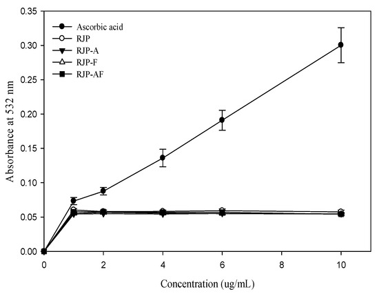 Bleomycin, an antitumor antibiotic, can bind to DNA and cause single-strand breaks in the presence of O2 and Fe2+ [41]. The presence of a reducing agent in the reaction system may accelerate the rate of bleomycin-Fe3+-induced DNA damage. A bleomycin assay has been used to assess pro-oxidant effects [42]. Accordingly, in this assay, bleomycin was used to assess the pro-oxidant activity of RJP and RJP hydrolysates. RJP and RJP hydrolysates did not exhibit any pro-oxidant effect (Figure 3), clearly explaining that RJP and RJP hydrolysates did not possess a strong reducing power and were not capable of reducing bleomycin-Fe3+ to bleomycin-Fe2+ and causing DNA damage.