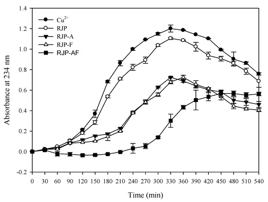 During incubation, the capacity of RJP and RJP hydrolysates to prevent LDL oxidation was evaluated by monitoring the generation of a conjugated diene. The absorbance was read every 30 min for 540 min using a Hitachi U-2000 spectrophotometer (Hitachi Co. Ltd., Tokyo, Japan) and the results were expressed as a relative absorbance at 234 nm. For each assay, measurements were performed at least in triplicate. The duration of the lag phase was calculated by extrapolating the exponential phase.