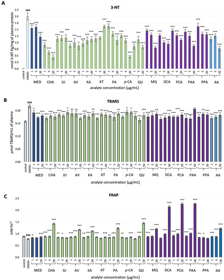 In plasma samples incubated with ONOO− in the presence of the investigated analytes (at 1–50 µg/mL), the rate of oxidative/nitrative modifications of the plasma components was significantly diminished (Figure 3A–C). All the tested analytes efficiently reduced the nitration of protein tyrosine residues (p < 0.001, Figure 3A). In the case of MED, the inhibition of 3-NT generation reached 22.5% and 39.1% at 1 µg/mL and 50 µg/mL, respectively. An Even larger decrease in the 3-NT level was found for model compounds (by about 18.6–57.5% and 19.3–77.8% at 1 µg/mL and 50 µg/mL, respectively). Native polyphenols such as CHA, AV, QU and KA inhibited the nitration of tyrosine residues (p < 0.001) by more than 50%, even at the concentration of 1 µg/mL. At 50 µg/mL, the highest inhibition was observed for CHA and p-CA (by about 77.81% and 76.86%, respectively). The investigated phenolic metabolites were also able to protect plasma proteins against 3-NT production (by about 19.2–36.4% and 34.4–59.8% at 1 µg/mL and 50 µg/mL, respectively). The activity of the positive standard AA was on a similar level, as the decrease in 3-NT was about 43.3% and 61.4% at 1 µg/mL and 50 µg/mL, respectively.