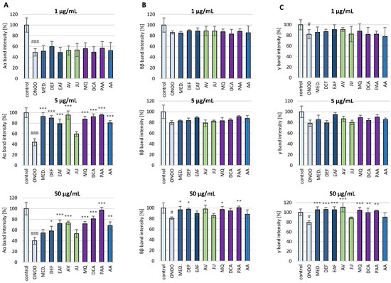 The effects of P. spinosa flower extracts, their native model constituents and potential in vivo metabolites on ONOO−-induced changes in the electrophoretic pattern of human fibrinogen: (A) The effects on the intensity of the band corresponding to the Aα chain; (B) The effects on the intensity of the band corresponding to the Bβ chain; (C) The effects on the intensity of the band corresponding to the γ chain. The SDS-PAGE was conducted under reducing conditions, using the 4–20% gradient gels. The Aα, Bβ and γ bands’ intensities in control fibrinogen (untreated with ONOO−) were assumed as 100%. Results are presented as means ± SE (n = 4). Statistical differences: ### p < 0.001 and # p < 0.05 for control fibrinogen versus ONOO−-treated fibrinogen (without the analytes); * p < 0.05, ** p < 0.01, and *** p < 0.001 for ONOO−-treated fibrinogen in the presence of the analytes (1, 5, 50 µg/mL) versus ONOO−-treated fibrinogen in the absence of the analytes. For the bars’ colors, see Figure 3.