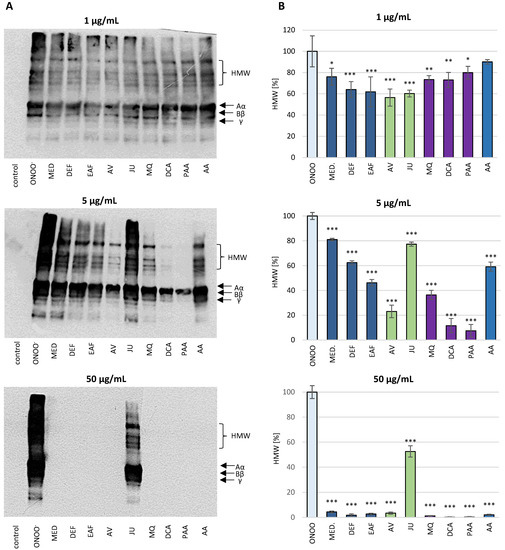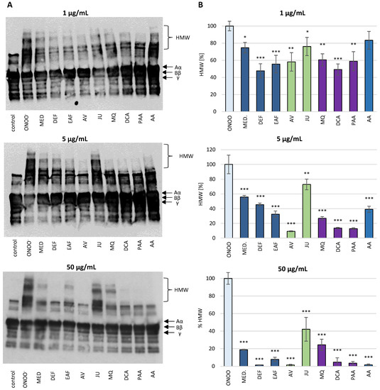 The pre-incubation of human blood plasma with the investigated analytes (1–50 µg/mL) evidently reduced the extent of the ONOO−-induced modifications of the structure of plasma fibrinogen (Figure 9). A dose-dependent reduction of the chemiluminescence intensity of bands corresponding to HMW aggregates was observed. Furthermore, the activity of the blackthorn flower extracts, model native compounds and metabolites was higher or comparable to the positive standard (AA).