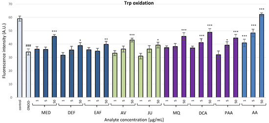 In the absence of any antioxidants, ONOO− induced a considerable oxidation of tryptophan residues in fibrinogen molecules (p < 0.001), confirmed by a 42.3% decrease in the fluorescence intensity of this amino acid. In fibrinogen samples treated with ONOO− in the presence of the investigated analytes (1–50 µg/mL), some reduction of the oxidative effects of ONOO− was observed (Figure 8). However, statistical significance (p < 0.05) was demonstrated only for the highest concentration of the extracts, model polyphenols and metabolites, except for DCA and PAA, which also considerably inhibited (p < 0.05) the oxidation of tryptophan residues at 5 µg/mL. The positive standard AA displayed the strongest antioxidant activity, as its effect was significant (p < 0.001) regardless of the concentration.