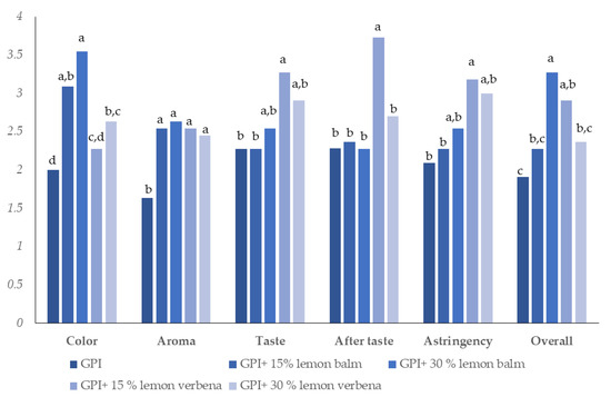 The flavor and taste of grape pomace infusion was neutral and flat. These characteristics allow its consumption, but the consumers may not enjoy it. Thus, the improvement of organoleptic attributes of infusion were attempted using Mediterranean aromatic plants. More specifically, lemon balm and lemon verbena were added to grape pomace powder at a concentration of 15% w/w and 30% w/w due to its special flavor and taste as well as they are widely consumed as herbal infusions. Furthermore, both plant materials displayed antioxidant, antimicrobial and antidiabetic activity, thus, their addition was not expected to deplete significantly the functionality of infusion [31,32,33]. Figure 1 summarizes the scores for sensory evaluation attributes of five grape pomace infusions. It reveals a substantial impact of herbs on the infusion’s color. The addition of lemon balm into grape pomace powder contributed to the most attractive color among the tested infusions. Specifically, the slight yellow to straw color of pure grape pomace infusion was altered to a brown color. On the other hand, the enrichment of grape pomace infusion with lemon verbena yielded a dark green colored infusion. Regarding the aroma, all mixtures of herbs with grape pomace had a better acceptance than pure grape pomace infusions. About of 50% of participants found a sweet taste for all infusions, because of the use of sun-dried grape pomace and only 27% of participants stated the presence of grape’s aroma in pure grape pomace infusion (data not shown). Infusions with lemon balm smells like herbs; whereas the participants found aroma of herbs and fruits in infusions with lemon verbena. Similar findings were reported for taste of infusions; albeit the panelists preferred the taste of grape pomace-lemon verbana infusions. The addition of both herbs did not change statistically the astringency and aftertaste. Furthermore, the scores of overall acceptance of infusions shows that the mixtures of 30% lemon balm to grape pomace and 15% lemon verbena to grape pomace were preferred, for the preparation of infusions. Finally, all participants declared that the pure grape pomace infusion was pleasant but the supplementation with common herbs improved its organoleptic attributes. The latter is maybe correlated to the fact that the panelists are familiar with the consumption of these herbal infusions.