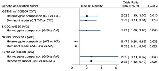 In this study, we found that six SNPs were significantly more prevalent in obese cohorts: (1) GSTM1 rs1056806*C/T heterozygosity, (2) SOD1 rs2234694*A allele, (3) SOD2 rs4880*G allele, (4) SOD3 rs2536512*A allele, (5) GPX1 rs1800668*A allele, and (6) NOS3 rs1799983*G allele. Furthermore, four variants from these SNPs showed significant association with the risk of developing obesity under several genetic association models that will be detailed in the next sections.