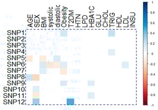 Correlation of genetic variants with patients’ characteristics. Correlation between gene variants and demographic/clinic-laboratory characteristics. Pearson correlation was applied, and a significant correlation coefficient is only shown. BMI: body mass index; systolic: systolic blood pressure, diastolic: diastolic blood pressure; T2DM: type 2 diabetes mellitus, HTN: hypertension; LPD: hyperlipidemia, HbA1C: glycosylated hemoglobin, GLU: glucose; CHOL: total cholesterol, TRIG: triacylglycerol; HDL: high-density lipoprotein; LDLL: low-density lipoprotein; INSU: serum insulin; SNP1: GSTM1 rs1056806, SNP2: GSTT1 rs17856199, SNP3: GSTP1 rs1695, SNP4: MGST3 rs2065942, SNP5: SOD1 rs2234694, SNP6: SOD2 rs4880, SNP7: SOD3 rs2536512, SNP8: CAT rs7943316, SNP9: GPX1 rs1800668, SNP10: GPX4 rs713041, SNP11: NOS3 rs1799983, SNP12: NOS2 rs2297518.