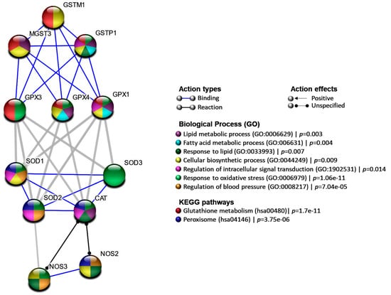 Our enrichment analysis of the studied antioxidant enzymes revealed their implication in several obesity-related pathways and processes such as lipid metabolism/response to lipid processes and dysregulation of fatty acid metabolism [59], cellular biosynthetic process derangement [60], intracellular signal transduction regulation, response to oxidative stress [61], and regulation of blood pressure [62], as shown in Figure 3.