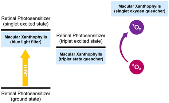 The macular xanthophylls accept deactivation of already existing singlet oxygen but may also prevent the generation of this excited form of oxygen. In fact, macular xanthophylls offer triple protection to cells against single oxygen: (i) they quench singlet oxygen directly, (ii) they prevent the generation of singlet oxygen by quenching the excited triplet state of photosensitizers, and (iii) they prevent the photosensitizers from being excited (blue light filtration function mentioned in Section 2.1) (Figure 3). The ocular chromophore may be in a long-lived excited triplet state. The energy from this long-lived state may be transferred to the ground state of oxygen (triplet oxygen), creating an excited site of oxygen (singlet oxygen). Carotenoids may transfer energy from the excited triplet state of photosensitizers to their own excited triplet states and then lose energy in the form of heat. The energy transfer only occurs over the short distance between the photosensitizer and the quencher. This process is well known for carotenoids in thylakoid membranes [52,53,54] but not for the retina. In the retina, singlet oxygen can be generated by all-trans-retinal phosphatidylethanolamine adduct (A2E) and other bis-retinoid constituents in the retinal pigment epithelia (RPE) [55,56]. Lutein and zeaxanthin are present in human RPE, but at a lower quantity than in prereceptoral layers. The RPE controls xanthophyll transport. Additionally, meso-zeaxanthin production from dietary lutein by RPE65 enzymes occurs in the RPE. The quenching of the triplet state of chlorophyll by carotenoids is crucial for photoprotection against singlet oxygen in photosynthetic organisms [53,54]. Unlike in photosynthetic organisms, photosensitizer–xanthophyll triplet-triplet energy transfer is not known to occur in the retina. Free all-trans-retinal is another potent photosensitizer photoactivated by UVA and blue light. The quantum yield of the triplet state of all-trans-retinal is high [57]. All-trans retinal is released in photoreceptor outer segments from the photoactivated visual pigment and converted back to 11-cis retinal within RPE as part of the regeneration process. Problems occur when all-trans-retinal is not efficiently cleared from retinal outer segment discs. Several studies indicate that all-trans-retinal, which is the precursor of A2E, has higher phototoxicity than A2E. Thus, all-trans-retinal bound to phospholipids has less photosensitizing activity than free all-trans-retinal, and the production of A2E may be a protective mechanism in the retina [58,59].