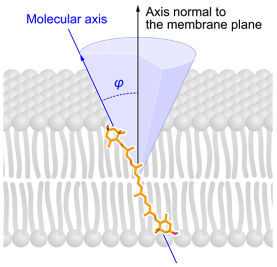 The first approach to determine the orientation of the macular xanthophyll molecule within the lipid membrane was based on the measurements of the linear dichroism of carotenoids embedded in the oriented lipid multi-bilayers [36]. In these measurements, a system of over 100 bilayers of lipids was placed on the glass substrate, and the UV–visible absorption spectra of polarized light parallel and perpendicular to the incidence plane of the lipid samples containing carotenoids were analyzed. This model system comprising stacked lipid bilayers seems ill-suited for the calculation of the precise orientation of macular xanthophylls in the lipid bilayer because analyzed molecules could localize in the intermembrane spaces. In the present studies, Gruszecki’s group analyzed a single lipid bilayer membrane, which meant that the fraction of molecules did not localize in the space between lipid bilayers [79]. The results of the molecular spectroscopy analyses (including linear dichroism and photoselection experiments based on light absorption, fluorescence, and resonance Raman scattering, combined with the computational molecular dynamics studies) show that macular xanthophylls—lutein and zeaxanthin—span the lipid bilayer and that two hydroxy groups are located in the opposite polar zones of the membrane [79]. The values of the average angle between the transition dipole moment and the axis normal to the plane of the membrane prepared from dimyristoylglycerophosphatidylcholine (DMPC) were very similar (i.e., 41.8° for zeaxanthin and 42.7° for lutein) [79]. It should be noted that an electronic transition dipole moment of carotenoids is not exactly oriented along the major axis of the polyene chain. There is approximately 10° ÷ 15° between the dipole transition and the molecular axis defined by the direction of the conjugated double bond system [80]. Thus, both zeaxanthin and lutein adopt transmembrane orientation with respect to the plane of the membrane (Figure 4). Additionally, electron paramagnetic resonance spin-labeling studies have shown similar effects of lutein and zeaxanthin on the physical properties of the lipid bilayer, supporting the transmembrane orientation of these two macular pigments [81,82,83]. The same transmembrane orientation of zeaxanthin and lutein in the model lipid membrane cannot explain the different spatial distributions and different functions of these pigments in the retina. This means that to explain the differences in the spatial distribution of lutein and zeaxanthin in the macula (a large amount of zeaxanthin in the central fovea and the presence of only lutein in the peripheral retina) [62], different molecular interactions or mechanisms functioning at the molecular level have to be considered. Structurally, zeaxanthin and lutein are similar. Both are dihydroxy xanthophylls with small differences in their ring structure. Zeaxanthin has two β-rings while lutein has one β-ring and one ε-ring. Due to the different location of a double bond in the ε-ring, lutein has a shorter conjugated double bond system than zeaxanthin. It is well known that most of the carotenoids common in plants and algae have two β-rings. Carotenoids with one β-ring and one ε-ring are also commonly present in plants and algae, but pigments with two ε-rings are rare [84]. All forms of vitamin A have a β-ionone ring. Canthaxanthin, which is used as an oral tanning agent and accumulates at a high dose in the foveal and perifoveal region in the form of crystals, is also a β-ionone ring carotenoid [85]. Recently, molecular dynamic simulation studies on the intercalation of lutein into the lipid bilayer have shown that lutein intercalates into the bilayer preferentially with its β-ring [86]. Conversely, the ε-ring docks in the active site of RPE65, the enzyme responsible for the conversion of lutein to meso-zeaxanthin in the retina [87], and docks in the cavity of the lutein-specific steroidogenic acute regulatory domain protein (StARD3) [88].