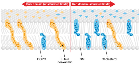 Schematic drawing showing the distribution of macular xanthophylls between the unsaturated bulk domain and the saturated raft domain in lipid-bilayer membranes. (see [90,95] for additional details). DOPC, dioleoylphosphatidylcholine; SM-sphingomyelin.