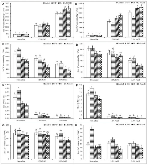 - Khan, M.N.; Siddiqui, M.H.; Mohammad, F.; Naeem, M. Interactive role of nitric oxide and calcium chloride in enhancing tolerance to salt stress. Nitric Oxide 2012, 27, 210–218. [Google Scholar] [CrossRef] [PubMed]