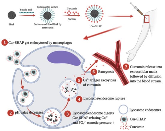 In the present study, calcium hydroxide (Ca(OH)2), phosphoric acid (H3PO4), and baking powder (foaming agent) were employed to prepare porous HAP particles. By using the following materials, we were able to create a greater space and surface area for curcumin loading. Surface modification of HAP was then employed to improve the curcumin loading efficiency. Compared to the surface area of commercialized HAP, Cur-SHAP could have improved curcumin accommodation due to its high porosity and surface area (based on BET results; Table 1). The FTIR spectrum of Cur-SHAP displayed all absorption bands for HAP and curcumin (Figure 2). By assessing the morphology of Cur-SHAP, we recognized many pores between the grains, which left a greater surface area as well as space to accommodate curcumin (Figure 3) [13]. The mixing of surface-modified HAP with curcumin was achieved via a simple physical adsorption that enabled easy short-term drug release without constant release over a long period. Curcumin in the developed Cur-SHAP not only exhibited surface adsorption but was also entrapped in the lattice and enclosed between the grain boundary. The molar ratio of calcium to phosphorus in HAP, SHAP, and Cur-SHAP ranged from 1.40 to 1.67 (Table S2). The release of curcumin in the grain boundary and crystal lattice, combined with the process of cellular endocytosis, enabled the rapid dissolution of the Cur-SHAP particles in the endosome/lysosome hybrid. This was due to the low pH value in the hybrid environment. Curcumin escaped from the hybrid and was subsequently transported to the extracellular matrix for the delivery of curcumin throughout the entire body via the nearest blood vessel. Previously, a thermodynamic model was reported for many nanoparticle systems. This model revealed that the optimum cellular uptake particle size to endocytosis was 0.5–5 μm. According to the SEM and DLS analyses, the particle size of synthesized Cur-SHAP ranged from 0.5 to 1.5 μm, which is adequate for endocytosis (Figure 3).