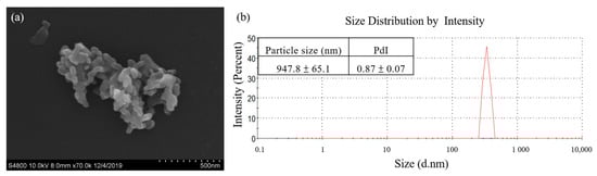 Morphology and particle size of Cur-SHAP. (a) SEM images of Cur-SHAP. The images reveal an open and interconnected porous structure. (b) Size distribution of Cur-SHAP analyzed by DLS. The results indicate that the Cur-SHAP particle size ranged from 900 to 1000 nm.
