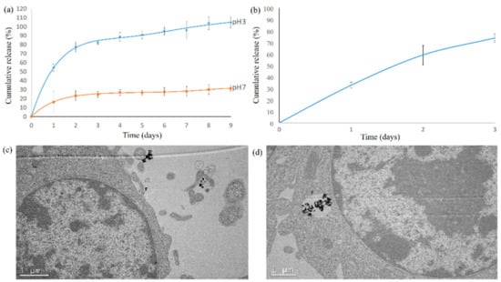 Release profile of curcumin. (a) The release profile of curcumin at pH 7 and 3, mimicking the conditions of the physiological environment and endosome/lysosome hybrid, respectively. (b) The drug release profile of Cur-SHAP co-cultured with RAW-264.7 macrophages; 70% of curcumin was consistently released within 2 d, presumably due to cellular activity. (c) TEM images of the interface of RAW-264.7 and Cur-SHAP particles prior to cellular uptake. (d) TEM images of Cur-SHAP particles transported to the lysosome, where the lysosome/endosome hybrid was inflated and ruptured due to the change in osmotic pressure.