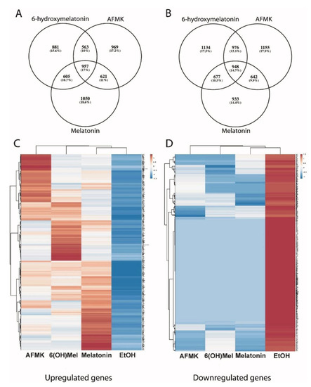 Analyses of differentially expressed genes in human keratinocytes treated with melatonin, 6-hydroxymelatonin and AFMK. Venn diagrams are in (A) for up- and in (B) for downregulated genes. Heatmaps for all upregulated genes are in (C) and for downregulated genes in (D), which are common for all tested compounds. Keratinocytes were treated with 10−5 M of melatonin, its metabolites or vehicle for 24 h and submitted for RNA-sequence analysis.