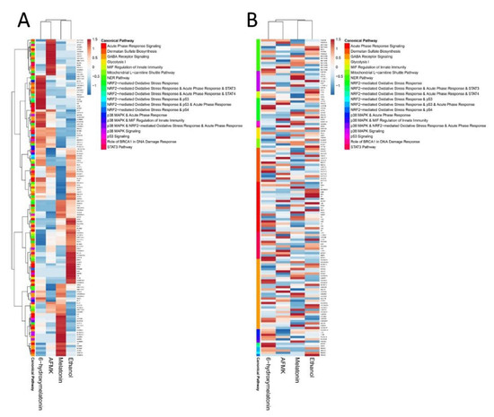 Heatmaps for NRF2 (A) and TP53 (B) signaling pathways after treatment of human epidermal keratinocytes with melatonin and its derivatives.
