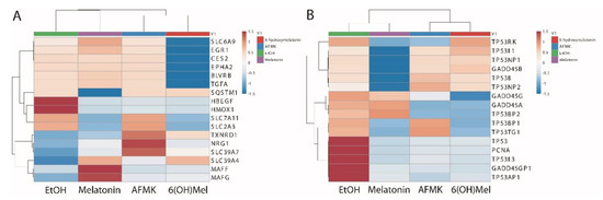 The profile and Z-scores of expressions of the genes involved in TP53 signaling are presented in Figure 3B. TP53BP1 and TP53TG1 were upregulated by AFMK. The expression levels of growth arrest and DNA damage-inducible protein gamma (GADD45G) and GADD45A increased after melatonin treatment, and TP53I3 and TP53INP2 were upregulated by AFMK and 6(OH)Mel. The increased GADD45G level is consistent with melatonin involvement in cellular stress responses and DNA repair processes, as well as tumor suppression [1,10,12,21,26,27].