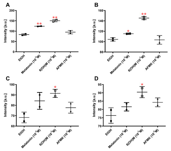 Profile of cytokine expression for melatonin, AFMK and 6-hydroxymelatonin after 24 h incubation in HEKn as results of Proteome Profiler Cytokine Array: (A) MIF, (B) IL1ra, (C) SERPINE1, and (D) CXCL1 protein expression. The plots represent all values with calculated means and significance was evaluated by Mann–Whitney U test with * p < 0.05 and ** p < 0.01.