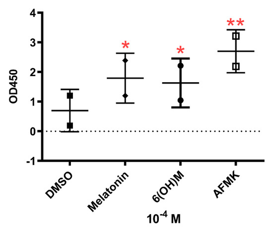 Changes in telomerase activity in epidermal HaCaT keratinocytes under influence of melatonin, 6-hydroxymelatonin or AFMK at a concentration of 10−4 M. The plots represent all values with calculated means and significance was evaluated by paired Student t-Test with * p < 0.05; ** p < 0.01.