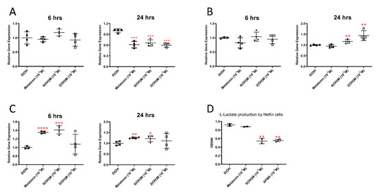The bioinformatics analyses presented in Section 3.1 and Section 3.2 that indicated an effect on energy yielding metabolism were substantiated by qPCR analyses. Specifically, melatonin and its hydroxymetabolites stimulated sirtuin 1 (SIRT-1) and PGC1α, while inhibiting LDHA gene expressions in HaCaT keratinocytes (Figure 6). The latter finding has been confirmed by inhibition of lactate production in cultured cells treated with 6(OH)Mel and AFMK (Figure 6D).