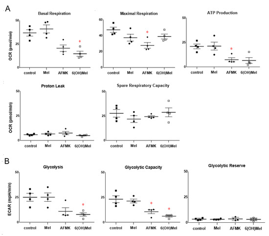 Next, we performed a comprehensive metabolic analysis using the Seahorse metabolic analyzer platform. The obtained data on the oxygen consumption rate (mitochondrial respiration, OCR, Figure 6A) and extracellular acidification rate (glycolytic function, ECAR, Figure 6B) showed consistency with the RNAseq, bioinformatics and functional analyses presented above. We noticed decreased basal respiration and ATP production 24 h following AFMK or 6(OH)Mel compared to control or melatonin stimulated conditions (Figure 7A). Maximal respiration, proton leak and spare respiratory capacity were unaffected by melatonin or its metabolites. Both AFMK and 6(OH)Mel, but not melatonin itself, significantly decreased glycolysis and glycolytic production in HEKn cells with a low oxygen consumption rate (Figure 7B), which is consistent with inhibition of lactate production by the compounds presented in Figure 5E. In general, these studies are in line with recognized abilities of melatonin and its metabolites to affect mitochondrial functions and their intramitochondrial metabolism [2,9,14,15,16,22,27,42,64].