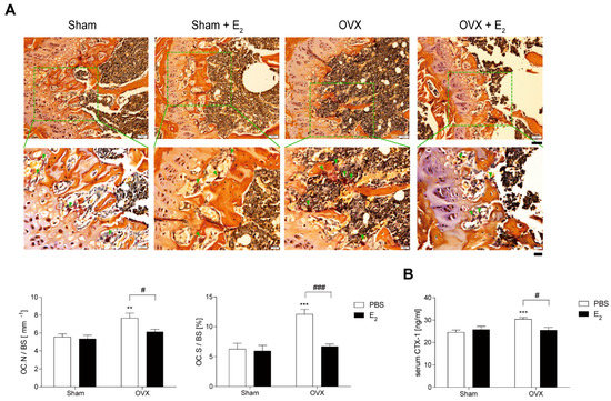 3.1. E2 Decreases Number and Size of OCs during Bone Loss in OVX Mice