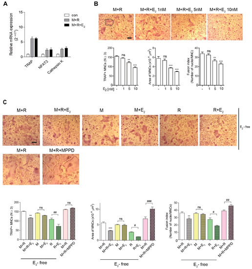 E2 inhibits the number and size of OCs during osteoclast differentiation in vitro. (A) RNA from bone marrow-derived macrophages (BMMs) cultured with M-CSF (30 ng/mL) and receptor activator of nuclear factor κB ligand (RANKL) (40 ng/mL) in the presence of E2 (5 nM) for 48 h was analyzed by qPCR. The expression level before RANKL treatment was set to 1. (B,C) BMMs were cultured with M-CSF (30 ng/mL) and RANKL (40 ng/mL) for 5 h, and then E2 (1 nM, 5 nM, 10 nM) (B) or MPPD (2 μM) (C) was added for another 16 h upon M-CSF and/or RANKL to determine TRAP-positive multinucleated cells (MNCs). After cells were fixed, more than 70 TRAP-positive MNCs in each culture were randomly selected. The area of formed OCs surrounded by the bold line was measured. The fusion index presented is the average number of nuclei per TRAP-positive MNC formed in the culture. Representative photos are shown. Scale bar in the representative OC photos: 100 μm. ** p < 0.01; *** p < 0.001 compared with vehicle group. # p < 0.05; ## p < 0.01; ### p < 0.001 compared with each corresponding control. Similar results were obtained in three independent experiments.