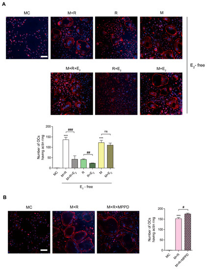 E2 inhibits RANKL-stimulated actin ring formation. BMMs were cultured with M-CSF (30 ng/mL) and RANKL (40 ng/mL) for 96 h. (A) Cells were incubated with α-MEM/10% FBS (media control, MC) or with E2 (5 nM) in the presence of M-CSF (M, 30 ng/mL) and/or RANKL (R, 40 ng/mL) as indicated. (B) Cells were incubated with α-MEM/10% FBS (media control, MC) or with MPPD (2 μM) in the presence of M-CSF and RANKL. After a 4 h incubation, the cells were stained with rhodamine–phalloidin and Hoechst to visualize actin ring and nuclei, respectively. (A,B) show representative images. Scale bar, 100 μm. The number of OCs having actin rings was plotted for the indicated conditions. *** p < 0.001 compared with MC. # p < 0.05; ## p < 0.01; ### p < 0.001 compared with each corresponding control. Similar results were obtained in three independent experiments.