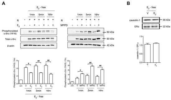 E2 transmits signaling via ERα, resulting in disrupted c-Src activation in a non-genomic manner. BMMs stimulated with RANKL (50 ng/mL) in the absence and presence of E2 (5 nM) or MPPD (2 μM) for the indicated time. (A) The cell lysate was immunoblotted for phosphorylated c-Src (Y416). (B) Cell lysates were prepared for co-immunoprecipitation with specific antibodies to ERα and subjected to immunoblotting as indicated. # p < 0.05; ## p < 0.01 compared with each corresponding control. Similar results were obtained in three independent experiments.