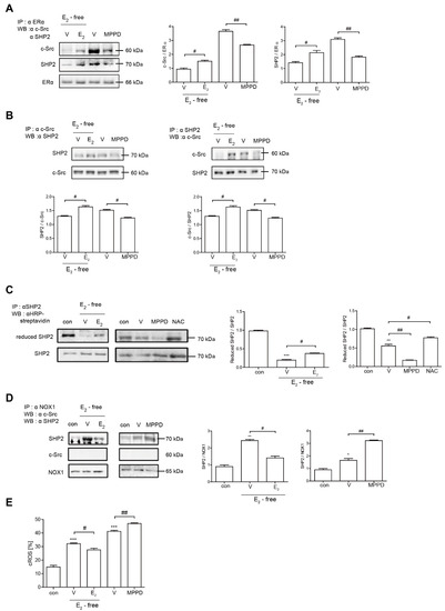 Because E2 more potently blocked RANKL-induced actin ring formation in OCs, we evaluated the effect of E2 on RANKL-stimulated signaling pathways that mediate cytoskeletal reorganization. RANKL-induced c-Src activation was evaluated by the phosphorylation of c-Src-Y416. E2 has been reported to transmit hormonal signals through genomic or non-genomic mechanisms [22,23,24]; therefore, we determined the times required for E2 to decrease c-Src activation. As shown in Figure 4A, E2 significantly reduced the amount of phosphorylated c-Src as early as 1 min exposure. Whereas the ERα antagonist, MPPD, increased phosphorylated c-Src (Supplementary Figure S1). Western blot analysis combined with co-immunoprecipitation showed a direct interaction between ERα and caveolin-1, a plasma membrane marker, in the absence or presence of E2 in OCs (Figure 4B, Supplementary Figure S1). Next, we determined whether ERα associates with c-Src to generate an E2 response upon RANKL stimulation in OCs. As shown in the top panel of Figure 5A, co-immunoprecipitation demonstrated that the direct interaction between ERα and c-Src upon RANKL stimulation was enhanced after E2 exposure, whereas it was attenuated upon MPPD treatment. Since tyrosine phosphatase is required to decrease c-Src activation, and SHP2 has been demonstrated to have a physical association with ERα [23], we evaluated whether this is the case when E2 was added in RANKL-stimulated OCs. As we expected, there was an increased association between SHP2 and ERα upon E2 exposure. The opposite result was observed with MPPD treatment (Figure 5A, Supplementary Figure S2). E2 was then shown to enhance the direct interaction between c-Src and SHP2 in the co-immunoprecipitation experiment with SHP2, followed by binding of c-Src, (Figure 5B, left, Supplementary Figure S2). The same phenomenon was observed with immunoprecipitation with c-Src and immunoblotting with SHP2 (Figure 5B, right, Supplementary Figure S2). Next, to investigate how the activity of SHP2 is regulated, we evaluated whether ROS affects the activity of SHP2 via oxidation. We labeled the cell with BIAM, which is a sulfhydryl-modifying reagent that exhibits selective binding with the thiolate form of reduced cysteine (Cys) residues. SHP2 was immunoprecipitated and biotinylated, and reduced fractions of SHP2 were conjugated with HRP–streptavidin. As shown in Figure 5C, SHP2 was oxidized upon RANKL stimulation, as there were decreased levels of the reduced form of SHP2, whereas E2 exposure reversed this effect. MPPD increased the oxidization of SHP2, whereas N-acetyl cysteine (NAC), a ROS scavenger, decreased it as a positive control (Supplementary Figure S2). Then, to find out the potential molecule that contributes to converting SHP2 by ROS generation, we examined whether SHP2 was modulated by its interaction with NOX1 upon E2 exposure. As shown in Figure 5D, RANKL induced a direct interaction between SHP2 and NOX1, whereas E2 decreased their association. The opposite was seen with MPPD treatment. However, NOX1 did not interact with c-Src in the presence of E2 or MPPD (Supplementary Figure S2). Next, we determined ROS generated from NOX1 upon exposure to E2 or MPPD to assess the activity of NOX1. RANKL alone increased ROS, whereas the addition of E2 decreased it, and MPPD reversed it (Figure 5E).