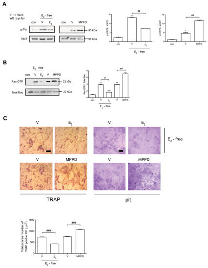 Recombinant mouse macrophage-colony stimulating factor (M-CSF) and receptor activator of nuclear factor κB ligand (RANKL) were obtained from R and D Systems, Inc. (Minneapolis, MN, USA). Estradiol, 2′,2′,2′-tribromoethanol, N-acetyl-l-cysteine (NAC), and Hoechst 33258 were obtained from Sigma Chemicals (St. Louis, MO, USA). MPPD was from Tocris (Bristol, UK). Minimum essential medium α (α-MEM) without phenol red and MicroAmp fast reaction tubes (8 tubes/strip) were from Life Technologies (Carlsbad, CA, USA). We obtained rhodamine–phalloidin from Molecular Probes (Carlsbad, CA, USA) and N-(biotinoyl)-N′-(iodoacetyl) ethylenediamine (BIAM) from Invitrogen (Carlsbad, CA, USA). Abs against phospho-tyrosine (4G10) was purchased from Upstate USA Inc. (Charlottesville, VA, USA), and Vav guanine nucleotide exchange factor 3 (Vav3) was from Abcam (Cambridge, MA, USA). c-Src-Y416 was obtained from Cell Signaling Technology (Denver, MA, USA); c-Src homology 2 (SH2) containing protein tyrosine phosphatase 2 (SHP2), estrogen receptor α (ERα), and caveolin-1 were from Santa Cruz Biotechnology (Santa Cruz, CA, USA); c-Src was sourced from ECM Biosciences (Versailles, KY, USA); NADPH oxidase 1 (NOX1) was from Novus (Centennial, CO, USA); and β-actin was from Sigma-Aldrich (St. Louis, MO, USA). In accordance with the manufacturer’s protocol, active Ras-related C3 botulinum toxin substrate (Rac) was measured using the Rac1 activation kit from Thermo Scientific (Rockford, IL, USA). The RatLaps kit (carboxy-terminal collagen crosslinks-1; CTX-1) EIA was from Immunodiagnostic Systems Inc. (Fountain Hills, AZ, USA).