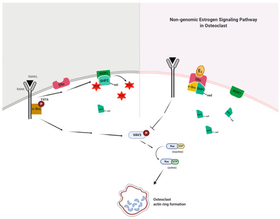 E2 signaling plays a critical role in an impaired actin ring formation. RANKL activates c-Src and transmits a signal to generate reactive oxygen species (ROS) via NADPH oxidase 1 (NOX1), resulting in the association of NOX1 and the oxidized form (inactive) of c-Src homology 2 (SH2)-containing protein tyrosine phosphatase 2 (SHP2) to decrease the availability of the reduced (active) form of SHP2. E2 binding to ERα forms a complex with active SHP2 and c-Src to attenuate RANKL-stimulated c-Src activation due to increased availability of the reduced form of SHP2 through the decreased interaction between NOX1 and the oxidized form of SHP2 in a non-genomic way. Dephosphorylation of c-Src is followed by the blockade of Vav3 and Rac1 activation by RANKL stimulation. This results in impaired actin ring formation in OCs and, therefore, reduced bone resorption.