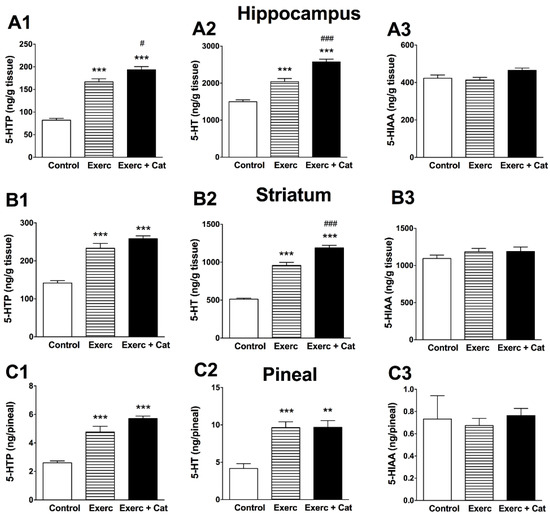 3.3. Effect of Exercise on Monoamine Synthesis and Metabolism in Hippocampus, Striatum and Pineal Gland