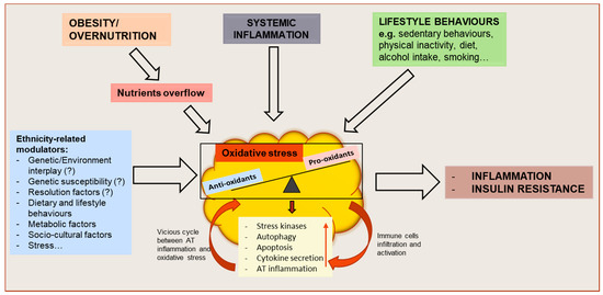 Schematic representation of oxidative stress drivers and metabolic consequences on adipose tissue (AT) function and whole-body metabolism. Obesity or overnutrition may result in nutrients overflow to AT, resulting in adipocyte hypertrophy and AT hypoxia which might induce an oxidative stress state in the tissue. Systemic inflammation, as well as behavioral factors, may also contribute to the disruption of the redox equilibrium of AT. As a result, the activation of stress signaling pathways contribute to increasing autophagy and apoptosis, dysregulated adipokine secretion and AT inflammation. The resulting functional alterations may further impair AT function by causing an increased attraction, infiltration and activation of immune cells and increased AT inflammation, creating a vicious cycle between AT oxidative stress and inflammation, and leading to whole-body metabolic dysfunction. These mechanisms might be influenced by ethnicity-related modulators.