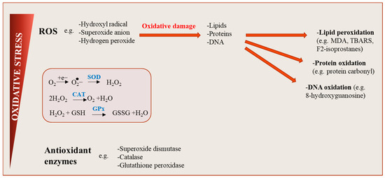 Oxidative stress can be evaluated in various tissues and body fluids using several techniques. However, due to a short half-life, reactive species are unstable molecules to measure. Accordingly, the quantification of oxidative stress in humans is mainly via indirect evaluation [49]. Hence, rather than the direct measure of ROS, the products from the oxidative (or nitrated) damage are assessed (e.g., malondialdehyde, F2-isoprostanes), as these products are more stable than reactive species. Alternatively, oxidative stress can be indirectly evaluated by measuring ROS-producing enzymes or antioxidant concentrations, expression or activities [49].