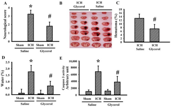 Intrastriatal collagenase injection for 24 h caused neurological deficits (Figure 1A), brain hematoma formation (Figure 1B,C), brain edema (Figure 1D), and caspase 3 activations (Figure 1E) in rats. A dose of intraperitoneal glycerol injection alleviated brain injury in hemorrhagic stroke rats (Figure 1). The findings suggest a beneficial effect of glycerol against hemorrhagic stroke brain injury.