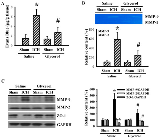 Glycerol alleviated hemorrhagic stroke BBB disruption. ICH and sham rats were intraperitoneally injected with saline or glycerol and housed for an additional 24 h. (A) The contents of Evans blue in the ipsilateral striatal tissues were measured. (B) Proteins were extracted from the ipsilateral striatal tissues and subjected to zymography assay. Representative gels and the quantitative data are shown. (C) Proteins were extracted from the ipsilateral striatal tissues and subjected to Western blot assay with indicated antibodies. Representative blots and the quantitative data are shown. Specific protein content was normalized with GAPDH. * p < 0.05 vs. sham/saline and # p < 0.05 vs. ICH/saline, n = 8.