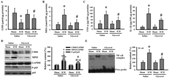 Glycerol alleviated hemorrhagic stroke oxidative stress and neuroinflammation. ICH and sham rats were intraperitoneally injected with saline or glycerol and housed for an additional 24 h. The contents of GSH (A) and MDA (B) in the ipsilateral striatal tissues were measured. (C) Proteins were extracted from the ipsilateral striatal tissues and subjected to ELISA for the measurement of TNF-α and IL-1β. (D) Proteins were extracted from the ipsilateral striatal tissues and subjected to Western blot assay with indicated antibodies. (E) Nuclear proteins were extracted from the ipsilateral striatal tissues and subjected to EMSA for the measurement of NF-κB DNA-binding activity. Representative blots and the quantitative data are shown. Specific protein content was normalized with the corresponding total protein or GAPDH. * p < 0.05 vs. sham/saline and # p < 0.05 vs. ICH/saline, n = 8.