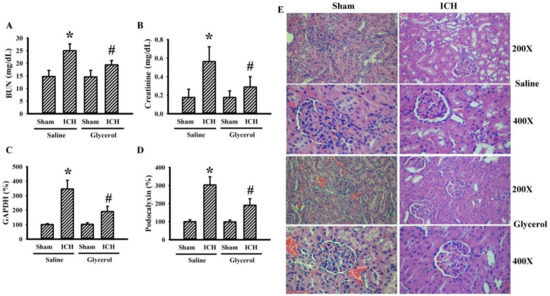 Glycerol alleviated hemorrhagic stroke-associated kidney dysfunction. ICH and sham rats were intraperitoneally injected with saline or glycerol and housed for an additional 24 h. Serum samples were subjected to the measurement of BUN (A) and creatinine (B). Urine samples were subjected to DNA isolation and PCR for the measurement of GAPDH (C) and podocalyxin (D) DNA content. Paraffin sections of kidney tissues were subjected to histological staining with H&E (E). Representative photomicrographs showed one of eight independent rats. * p < 0.05 vs. sham/saline and # p < 0.05 vs. ICH/saline, n = 8.