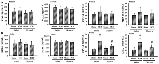 Glycerol alleviated urine biomarkers in hemorrhagic stroke rats. ICH and sham rats were intraperitoneally injected with saline or glycerol and housed for an additional 24 h. Serum (A) and urine (B) samples were subjected to ELISA for the measurement of KIM-1, NGAL, and CINC-1 as well as to TBARS assay for the measurement of MDA. * p < 0.05 vs. sham/saline and # p < 0.05 vs. ICH/saline, n = 8.