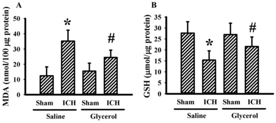 Glycerol alleviated kidney oxidative stress in hemorrhagic stroke rats. ICH and sham rats were intraperitoneally injected with saline or glycerol and housed for an additional 24 h. Kidney cortical tissues were isolated and subjected to the measurement of MDA (A) and GSH (B) * p < 0.05 vs. sham/saline and # p < 0.05 vs. ICH/saline, n = 8.